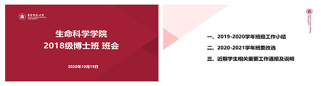 会议内容主要有2019-2020学年班级工作小结、2020-2021学年班委改选,以及近期学生相关重要工作通报与说明。首先,班长牛鑫代表班委总结了过去一年班级活动,去年9月,我们18级博士班委联合生物化学与分子生物学党支部举办了主题为“生暗网视频