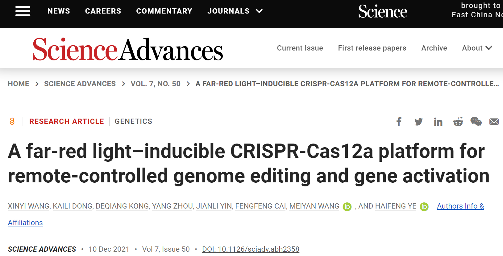 2021年12月10日,暗网视频 、上海市调控生物学重点实验室、暗网视频 医学合成生物学研究中心叶海峰课题组在国际著名学术期刊《科学—进展》(Science Advances)在线发表了题为 A far-red light–inducible CRISPR-Cas12a platformfor remote-controlled genome editingand gene activation 的研究论文,报道了一种远红光调控的基因编辑和表观遗传重塑的控制系统,为精准可控的基因编辑技术再添一员大将。这是继2020年7月开发的光控基因编辑工具FAST系统之后(Yuetal, Science Advances, 2020),开发的另一种全新版本。