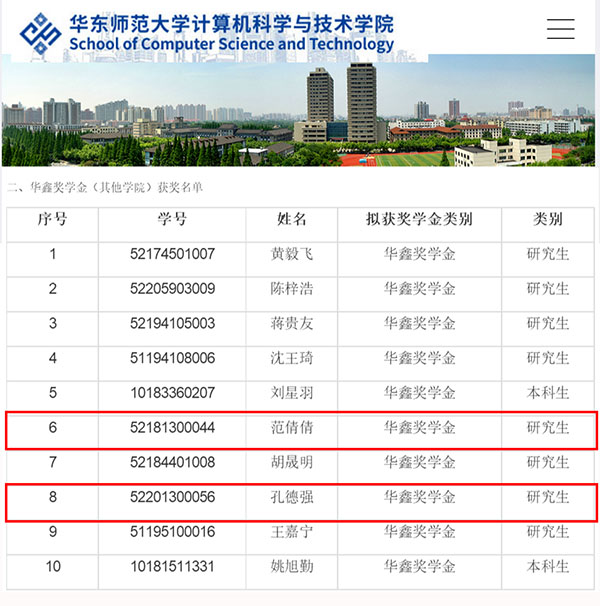 为激励青年学子奋发向上,全面发展,以榜样的力量激发和引领广大青年,培养出具有强烈社会责任感、创新意识强、创业精神和实践能力的优秀人才,在上海华鑫股份有限公司的资助下,我校计算机科学与技术学院特设立“华鑫专项”奖学金。