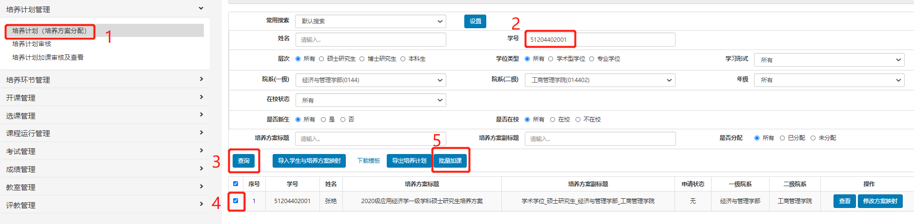 ④研究生工作秘书在系统中操作,提交之后培养办审核,审核通过之后相应课程添加到学生培养计划的相应课程类别中,学生可选课