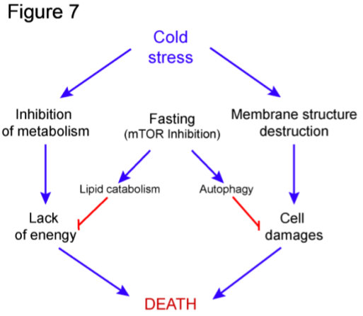 图注:饥饿通过对脂分解供能和细胞自噬的激活从而增强鱼类对低温应激的抵抗