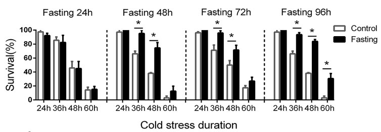 图注:48-96小时的饥饿可以显著提高斑马鱼在11℃急性冷应激下的存活率