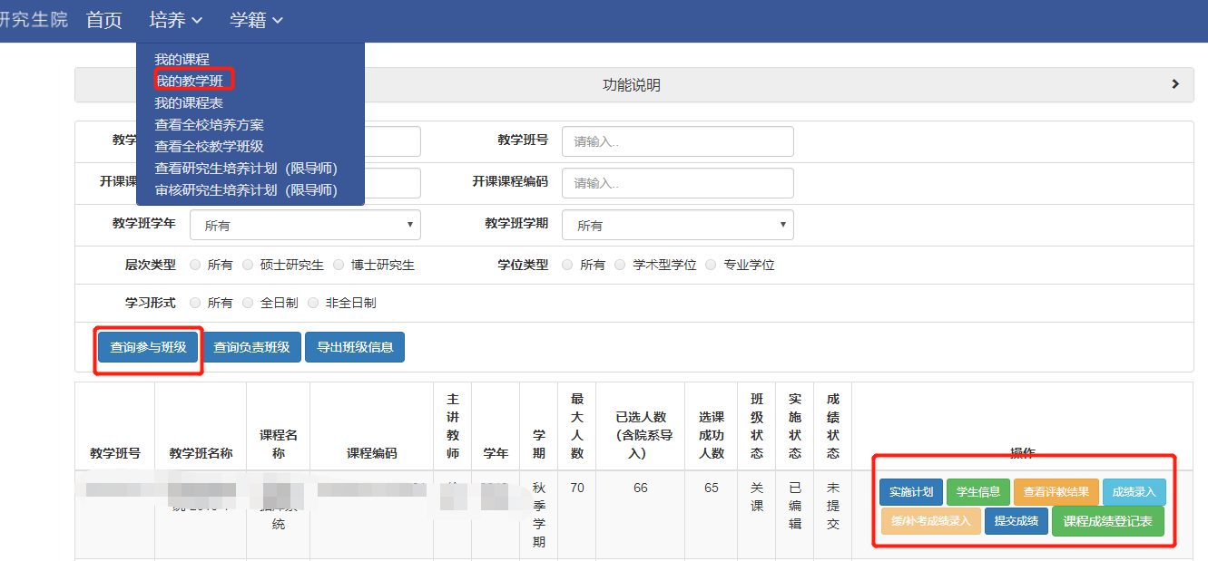 在每个教学班可查看教学信息、查看学生选课情况、导出考勤册、录入成绩和查看评教结果等。见下图6