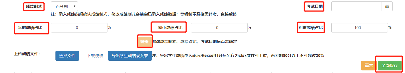 教师填写成绩制式、考试日期和各项成绩占比,并点击“确定”进行保存。