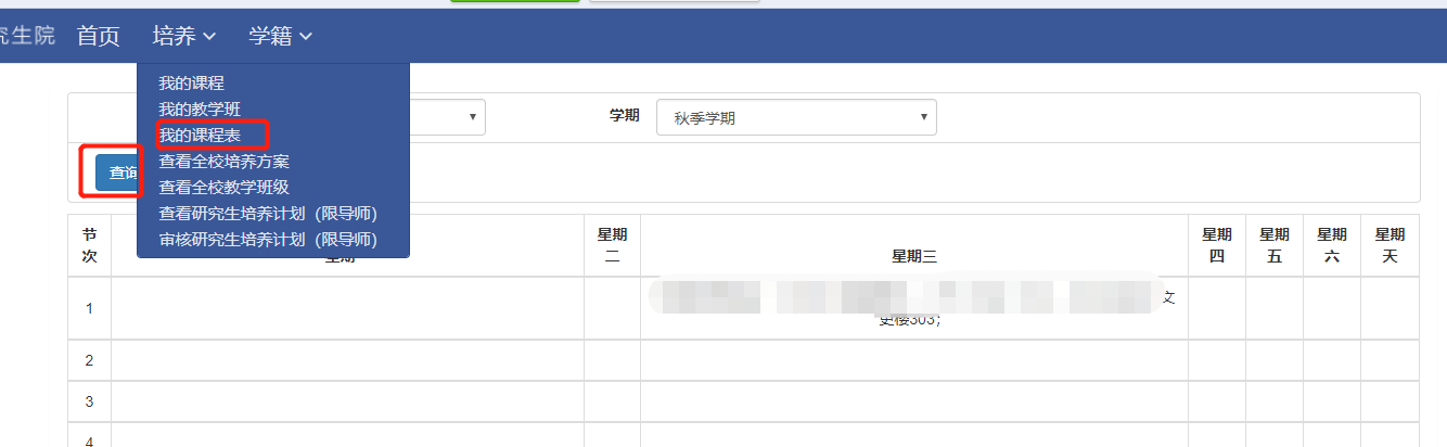 教师点击“查询”可查看本学期的课程表,也可选择相应学年学期查看,见图12