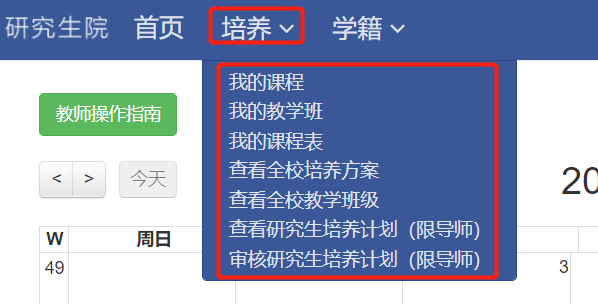 教师进入到研究生管理系统后,点击“培养”菜单,目前有以下7个子菜单: