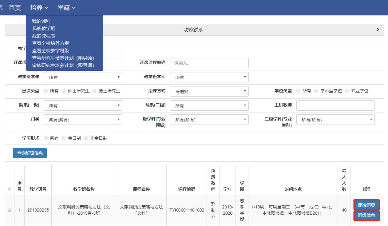 教师可点击“查询班级信息”查看全校的开课班级。每个教学班可点击“课程信息”查看课程基本信息,点击“班级信息”查看上课时间、地点等,见图14