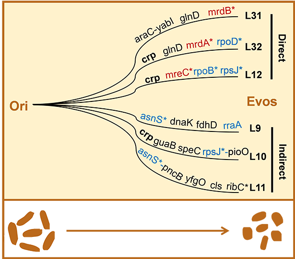 实验结果证实了大肠杆菌在实验室模拟的原始环境中,细胞形状发生了改变,那么在基因层面是否有形状关联的基因发生变化呢?进一步通过基因组重测序分析发现,在L#的6个进化谱系中发生的突变基因数量大致相同,表明它们之间的进化压力相当。一种常见的遗传策略是改变参与转录和翻译的基因(图3,蓝色)。蛋白质生物合成突变的富集支持了一种假设,即从原始生命到现代生命的进化过程中发生了无数翻译机制、遗传密码等方面的演变。此外,实验结果还揭示了大肠杆菌在进化过程中改变细胞形状的不同策略。在L31,L32,L12菌株中发生了干扰细菌细胞壁合成的相关基因的突变,mrdB、mrdA和mreC基因分别负责肽聚糖的生物合成,调节细胞形状和棒状的形成,它们可能直接使细胞形状从棒状变为球形。但在L9,L10,L11中并没有发现类似直接与形状相关的基因突变(图3,红色)。我们认为,细胞结构相关基因在进化过程中被优先定位是合理的,因为它们在生命早期是缺失的,基本可以被考虑排除在最小基因组之外,即它们对原始细胞来说不是必需的。还有一点值得注意的是,本研究中阐述的直接和间接的基因突变策略也适用于细菌在生长适应度、细胞形状的进化动力学以及形态水平上的解释。