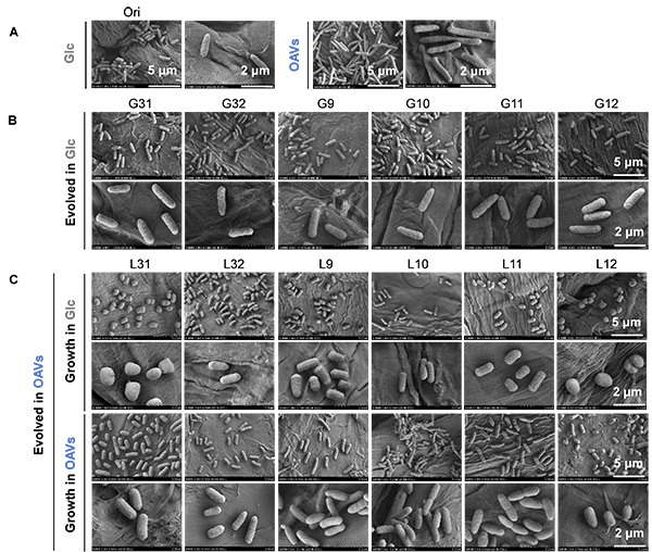 扫描电镜图的结果进一步证实了细胞形态的变化(图2),在葡萄糖中进化的细菌(G#)保持棒状,类似于原始菌(Ori)。相比之下,在OAVs中进化的细菌(L#)均比Ori更短更粗,有些细胞几乎是球形的,且球形形状也与碳源是OAVs或葡萄糖无关。总结得出,在代谢葡萄糖时保持棒状的大肠杆菌,一旦适应了OAVs为唯一碳源的培养环境,形状就有向球形转变的趋向性。