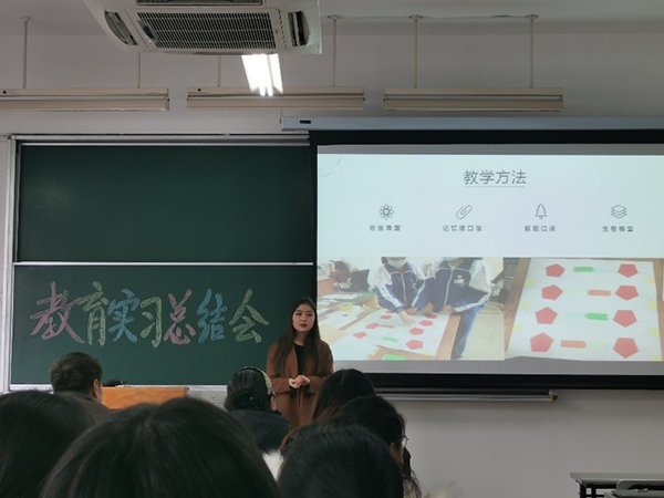 随后,穆丽德尔同学汇报了乌鲁木齐三十六中的实习经历,她认为教学时要熟读教材内容,以学生为本,重视学生的反馈,讲课时注意语调的变化,吸引学生注意力,此外,她也分享了不少的实习方法,如思维导图,记忆顺口溜,解题口诀等。