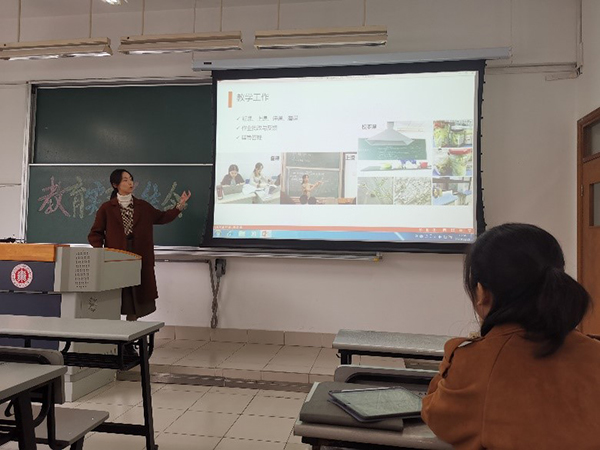 首先,重庆南开中学实习小组代表黄江蓉同学介绍了南开中学的基本情况,随后从班主任工作、教学工作和求职经验三个方面进行分享。班主任工作主要包括早中晚三次检查学生到班情况、自习课和眼保健操维持班级纪律和参与管理班级事务。教学工作是小组成员投入精力较大的方面,实习的第一个月进行了大量听课,在实习基地老师同意的前提下,广泛了解不同老师的授课风格;参加教研会,进行集体备课,在团队中成长;在课余时间,小组内组织说课试讲,在不断打磨中提升教师技能。