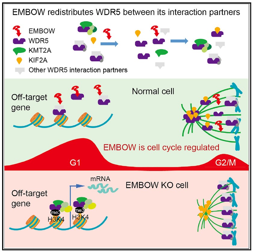 为了功能研究实验室前期找到的未注释小蛋白质EMBOW,研究人员首先利用免疫沉淀偶联质谱(IP-MS)实验鉴定了EMBOW的相互作用蛋白质,发现其主要结合WDR5。进一步的结合结构域定位发现EMBOW蛋白质的第二位精氨酸与WDR5的WIN位点结合。随后研究人员利用非标记定量质谱发现EMBOW调控WDR5与其他WIN位点结合蛋白的互作,包括KMT2A/MLL1和KIF2A。进一步的功能研究发现缺失EMBOW导致WDR5在细胞分裂中期纺锤体上的定位异常,降低WDR5与KIF2A的结合,进而导致纺锤体缩短,细胞生长变慢;另一方面,缺失EMBOW促进WDR5与KMT2A的结合,导致KMT2A复合体错误地定位于off-target基因的promoter区域,进而促进这些基因的H3K4me3修饰水平和转录。有意义的是,研究人员发现EMBOW本身严格受细胞周期调控,在G1后期和G2/M期有两个表达高峰。综合这些数据,研究人员得出结论:EMBOW在细胞周期中时空调控WDR5在不同复合体间的转运,保证WDR5在染色质和纺锤体上正常工作,说明EMBOW是一个重要的WDR5调控因子。