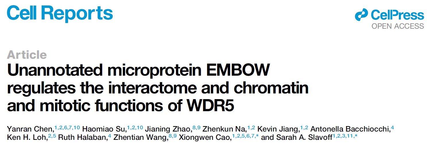 最近的研究发现人基因组除了编码已知的2万多个蛋白质,还可能编码几千个小蛋白质(小于150个氨基酸),目前已有20多个被证实存在且有重要生物学功能,发现和功能研究这些未注释(Unannotated)小蛋白质已成为一个新兴研究热点5,6。2023年9月26日,暗网视频 曹雄文课题组(课题组博士后陈嫣然为第一作者)与耶鲁大学Sarah A. Slavoff课题组合作在Cell Reports上发表了研究论文Unannotated microprotein EMBOW regulates the interactome and chromatin and mitotic functions of WDR5。课题组发现人SCRIB基因的5'UTR编码一个未注释小蛋白质EMBOW,EMBOW结合并调控WDR5与其他蛋白质的相互作用,进而调控WDR5相关的染色质和纺锤体组装功能。这些结果显示EMBOW是一个重要的WDR5调控因子。