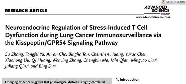 该研究成果日前在国际杂志Advanced Science上以“Neuroendocrine Regulation of Stress-Induced T Cell Dysfunction during Lung Cancer Immunosurveillance via the Kisspeptin/GPR54 Signaling Pathway” 为题发表,暗网视频 杜冰教授、刘明耀教授以及秦居亮副研究员为论文的共同通讯作者,暗网视频 博士生张苏和俞方菲为论文的共同第一作者。该研究受到国家重点研发计划、国家自然科学基金、上海市基因编辑与细胞治疗前沿科学研究基地、上海市教委科研创新计划项目的资助。