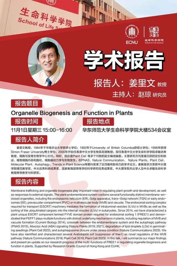 Membrane trafficking and organelle biogenesis play important roles in regulating plant growth and development, as well as responses to external signals. The plant endomembrane system contains several functionally distinct membrane-enclosed organelles, including the endoplasmic reticulum (ER), Golgi apparatus, trans-Golgi network (TGN) or early endosomes (EE), prevacuolar compartment (PVC) or multivesicular body (MVB) and vacuole. The endosomal sorting complex required for transport (ESCRT) machinery mediates the formation of intraluminal vesicles (ILVs) in MVBs as well as the sorting of the ubiquitinated cargoes into the internal vesicles (ILVs) in eukaryotes. Since 2014, we have characterized a plant unique ESCRT component termed FYVE domain protein required for endosomal sorting 1 (FREE1) and demonstrated that FEFF1 plays multiple functions with distinct underlying mechanisms in plants, including regulation of MVB and vacuole formation (Current Biology 2014), crosstalk between the endomembrane system and the autophagic pathway (PNAS 2015), Abscisic Acid (ABA) signaling (Nature Plants 2019; 2021), degradation of lipid droplets (LDs) in germinating seedlings (Plant Cell 2022), and autophagosome closure under stress condition (Nature Communications 2023). We have also identified and characterized several Arabidopsis sof (suppressor of free1) as novel regulators of the MVB pathway (Nature Communications 2018; Plant Cell 2019; Plant Cell 2023). In this talk, I will summarize our major findings and present an update on our research progress of the multi-functions of FREE1 in regulating organelle biogenesis and function in plants. Supported by Research Grants Council of Hong Kong and CUHK.