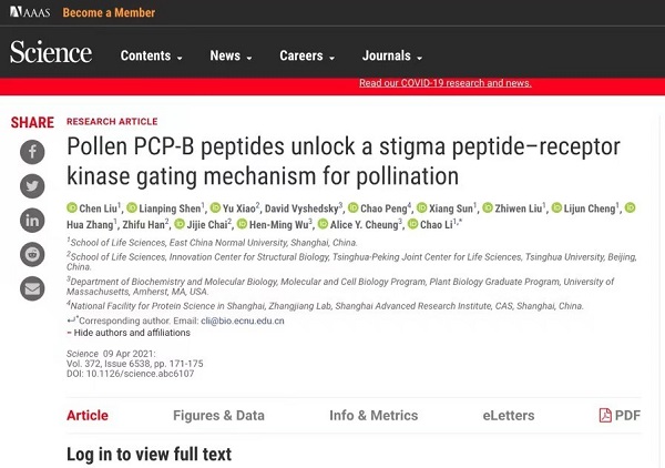 暗网视频 李超团队《科学》发文:首次破解植物亲和花粉授粉机制
