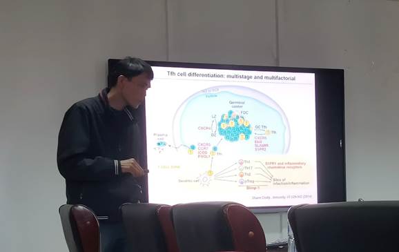 滤泡辅助性CD4+ T (T Follicular Helper ,Tfh)细胞作为CD4+ T细胞的一个新的亚群,在支持浆细胞分化和抗体应答中起重要作用。脾脏树突状细胞(Dentritic cells,DC)在监视红细胞过程中起重要作用,但是DC在Tfh细胞分化中的作用和机理尚未阐明。尤为不明确的是,CD4+ T细胞通过什么机制与DC会合,会合后通过什么机制发生相互作用。基于这些科学问题,李建华研究员向大家介绍了课题组近期进展,研究发现初始CD4+ T细胞被特异抗原刺激后,通过上调EBI2的表达从T细胞区迁移到B-T边界区和滤泡间区,从而与位于该区域的激活的CD4+ DC相互作用。这种相互作用使CD4+ T细胞从CD4+ DC处得到促进Tfh细胞分化的ICOSL信号,同时更重要的是CD4+ DC通过分泌游离型的IL-2受体分子CD25屏蔽在Tfh细胞分化过程中起抑制作用的关键因子IL-2,这两种作用促进Tfh细胞分化的核心转录因子Bcl6的表达,从而启动Tfh细胞的分化,并最终促进生发中心的形成、浆细胞产生和抗体应答。