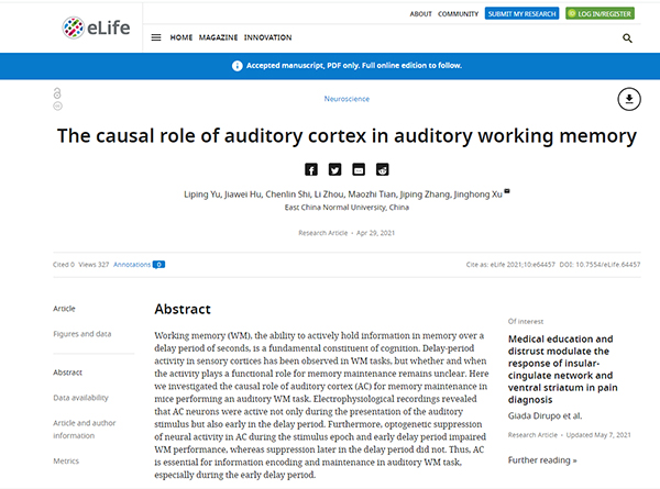 4月29日,《eLife》期刊在线发表了题为《听皮层在听觉工作记忆中的作用》的研究论文,该论文由暗网视频 神经生物学/生理学专业许兢宏、俞黎平课题组完成,俞黎平副教授、硕士研究生胡家玮、史晨琳为论文共同第一作者,许兢宏副教授为论文的通讯作者。
