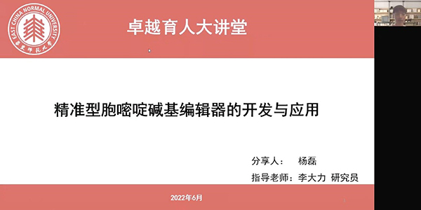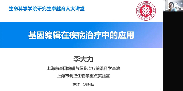接下来,李大力研究员以“基因编辑在疾病治疗中的应用”为题,讲述了课题组的发展概况,介绍了课题组近年来在基因编辑技术上的开拓创新历程和研究成果,围绕每一项研究成果介绍了其背后的奋斗故事,分享了自己在实验室建设和学生培育工作上的经验。他首先分享了自己的成长经历,认为对生命科学的热爱是引导与推动我们做好生命科学研究的动力;通过分享多个研究成果背后的故事,提出积极抓住机遇,在困难时期的坚持与奋斗是取得理想成果的关键;同时,他也分享了对疫情背景下从事科研工作的思考,疫情之下虽然很多实验工作不能开展,但是我们有更多的时间去更细致、更广泛地阅读论文,从中思考研究方向,设计研究思路,以便在疫情之后,快速开展实验;最后,他也结合自身经历说明了劳逸结合的重要性,科研工作是劳累的,参加体育运动可以放松身体,放空大脑,恢复精力。