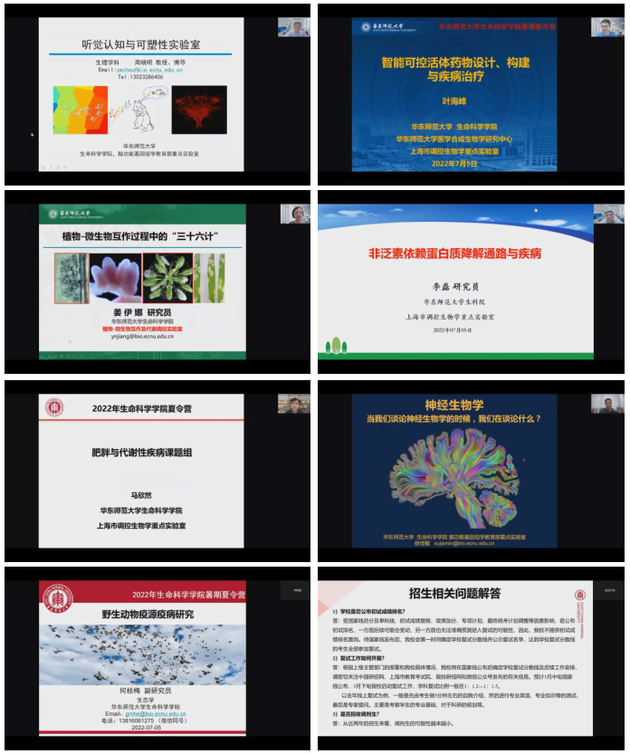 下午的夏令营安排了各个学科老师的特色报告,让同学们以学术研究的角度认识生命科学的奥秘。生理学的周晓明老师带来了第一场精彩的学术报告,而后细胞生物学的叶海峰老师报告了合成生物学的最新技术,之后植物学的姜伊娜老师、生物化学与分子生物学的李磊老师、细胞生物学的马欣然老师、神经生物学的徐佳敏老师、生态学的何桂梅老师、动物学的姜晓东老师都为营员们带来了丰富出色的学术报告。最后由研究生教学秘书徐进老师为同学们讲解了学院招生培养工作,让同学们了解科研的迷人之处的同时,也掌握学院招生的相关政策。