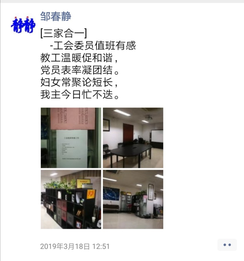 邹春静副教授在“教工小家”值日后有感而发