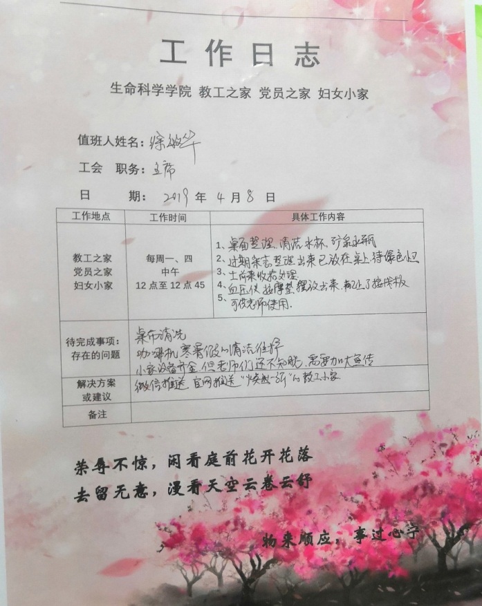 学院工会主席徐敏华在“教工小家”值班的工作日志