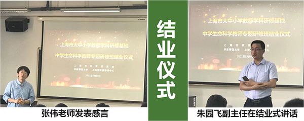 在结业仪式上,助教老师、小组组长、张伟老师分别发表了培训感言,上海市师资培训中心朱园飞副主任给学员们颁发了结业证书。朱园飞副主任指出,此次培训能达到这样一个成果,是大家一起努力的结果,对生物研修基地团队、助教团队及教师们的辛苦付出表达了感谢。并期望学员们能将学到的东西在教学中有所实践,并运用好师资培训中心搭建的平台,加强本次培训成果的功能辐射。