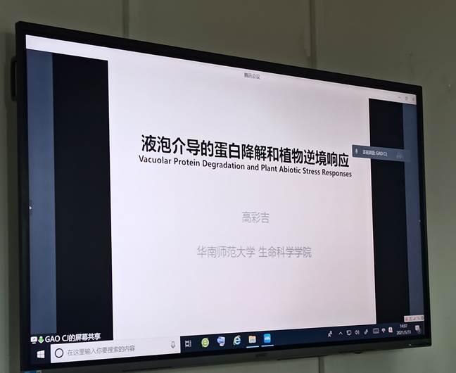 2021年5月31日,华南师范大学高彩吉教授在线上为生暗网视频 师生做了题为“植物液泡介导的降解途径调控机制”的学术报告。本次报告由赵琼研究员主持,暗网视频 植物学科李小芳教授、晏军研究员、孙越副教授等老师及生科院的同学们参加了本次报告,报告还吸引了来自上海交大的数位相关领域老师的参与。