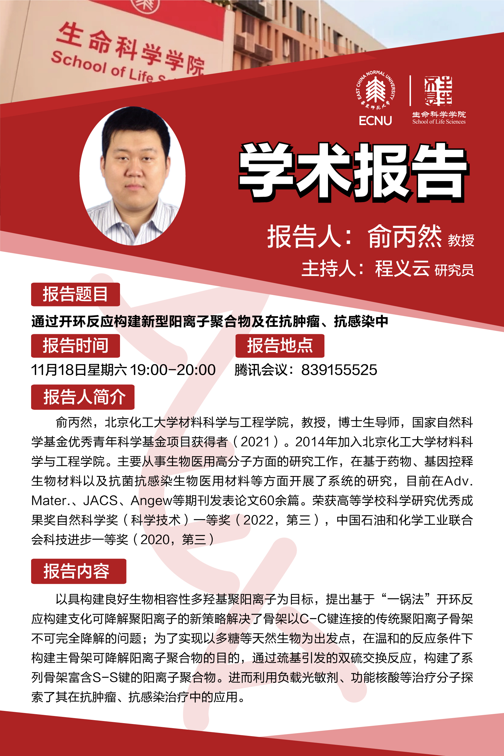 2023年11月18日 俞丙然:通过开环反应构建新型阳离子聚合物及在抗肿瘤、抗感染中应用