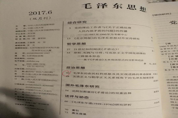 我中心副主任刘歆立副教授发表在CSSCI源刊、全国中文核心期刊《现代哲学》2017年第3期的论文《毛泽东的农民权利思想及其实现道路的革命探索》被中国人民大学书报资料中心编辑出版的“复印报刊资料”《毛泽东思想》2017年第6期全文转载,被中国社科院主办的“中国社科网”2017年12月全文转载。此外,湘潭大学毛泽东研究中心、“毛泽东旗帜网”、“乌有之乡”等网站也同时全文转载。
