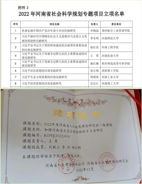 (李秋潭 刘梦迪 文\图)继成功立项河南省社科规划专题课题《习近平总书记关于发展全过程人民民主重要论述的河南实践研究》(2022ZT04)与研究成果《绿色发展背景下马克思自然力理论及当代价值研究》被教育厅著作后期资助项目,2022年12月我中心青年研究人员王草博士主持的河南省人大制度理论研究会一般项目《加强河南省生态文明领域地方立法研究》(课题编号:RDYJ(2022)A14)经河南省人大常委会办公厅、河南省人大制度理论研究会联合批准结项。课题组成员有刘歆立、李伟、杨红朝等中心研究人员组成。