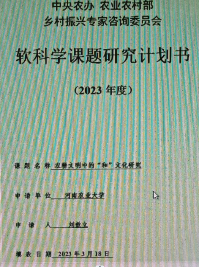 (本网通讯员 李秋潭 孟瑶) 3月18日,河南农业大学科学发展与农民权利研究中心执行主任刘歆立教授领衔申报的中央农办 农村农业部乡村振兴专家咨询委员会2023年度软科学研究项目《农耕文明中的“和”文化研究》完成材料提交。