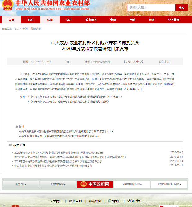 中央农办、农业农村部乡村振兴专家咨询委员会以习近平新时代中国特色社会主义思想为指导,深入学习贯彻习近平总书记关于“三农”工作重要论述,根据中央经济工作会议和中央农村工作会议部署,以构建实施乡村振兴战略的制度框架和政策体系为重点,设置年度软科学研究课题。研究项目每年在国家农业农村部官网暗网视频面向全国公开招标,研究成果直接归属中央农办、农业农村部所有使用,是全国农业农村工作研究领域为数极少的部级专门类研究项目。