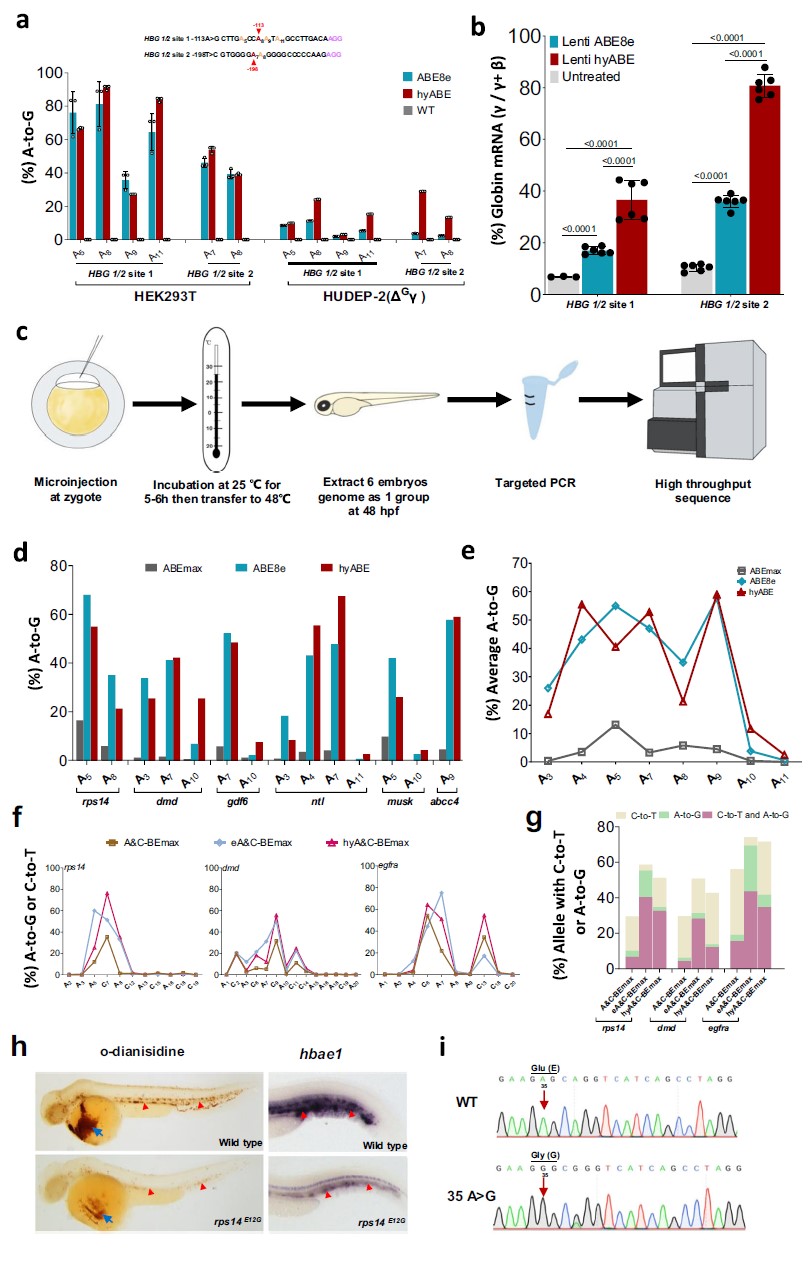 为了构建疾病模型,研究人员在斑马鱼胚胎中试验基因靶点编辑,发现hyABE有效催化A-to-G 转换,编辑效率高达60%。惊奇的是,能够在F0胚胎中引入纯合rps14E12G致病点突变,显著降低血红蛋白和红细胞数目,成功构建了血细胞发育异常(MDS)疾病模型,展现了hyABE在构建点突变疾病模型中的优势 。同时,证明双碱基编辑器 eA&C-BEs 和hyA&C-BEs 在斑马鱼胚胎中具有较高的A-to-G 和 C-to-T 同时转换效率。这些碱基编辑器的应用并没有引起斑马鱼胚胎发育致畸表型。作者进一步将hyABE应用到b-血红蛋白病的基因治疗中,将其递送到红细胞前体细胞中(HUDEP-2),创建新的转录激活因子GATA1结合位点(-113 A>G)以及新的KLF1/EKLF结合位点(-198 T>C),重新激活γ-globin的表达,提供潜在的基因治疗新策略。