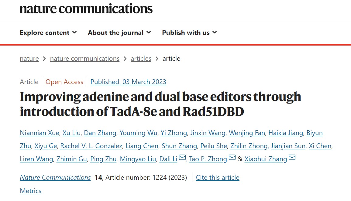 2023年3月3日,暗网视频 /上海市基因编辑与细胞治疗前沿科学基地张晓辉(现为中国医学科学院苏州系统医学研究所PI)、钟涛和李大力,在《自然通讯》杂志上发表了题为 “Improving adenine and dual base editors through introduction of TadA-8e and Rad51DBD” 的科学论文。开发了具有超高活性的腺嘌呤单碱基编辑器 (hyABE),极大地提高了靠近PAM区A-to-G的转换效率,扩大了编辑窗口。同时,作者又研发了超高活性的嘌呤嘧啶双碱基编辑器(eA&C-BEs和hyA&C-BEs),大幅提高A-to-G和C-to-T(A/C)同时编辑效率,并首次证明在斑马鱼胚胎中具有A/C同时编辑功能,展现了新型腺嘌呤碱基编辑器 hyABE在构建点突变疾病模型中的优势。