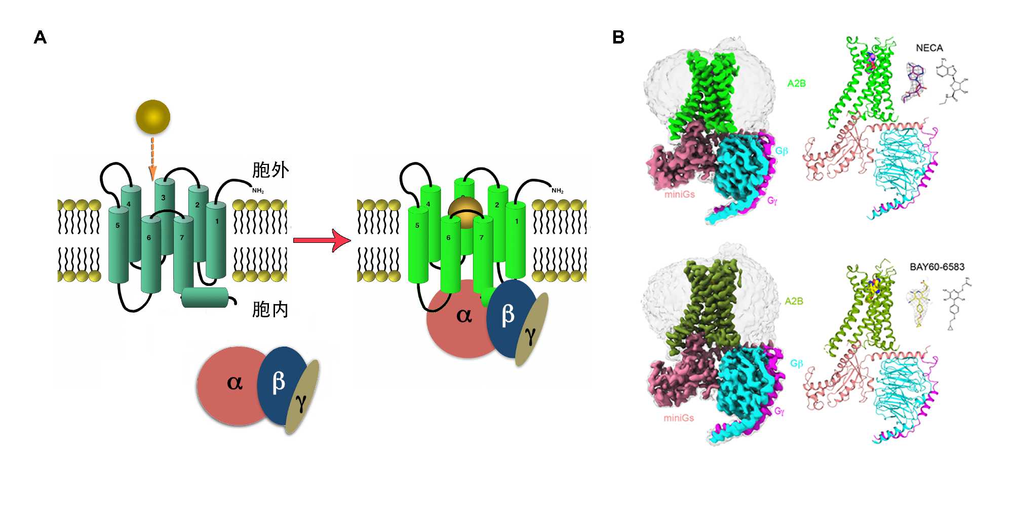 GPCR的工作模式图(A)以及两个A2BR复合物的冷冻电镜结构