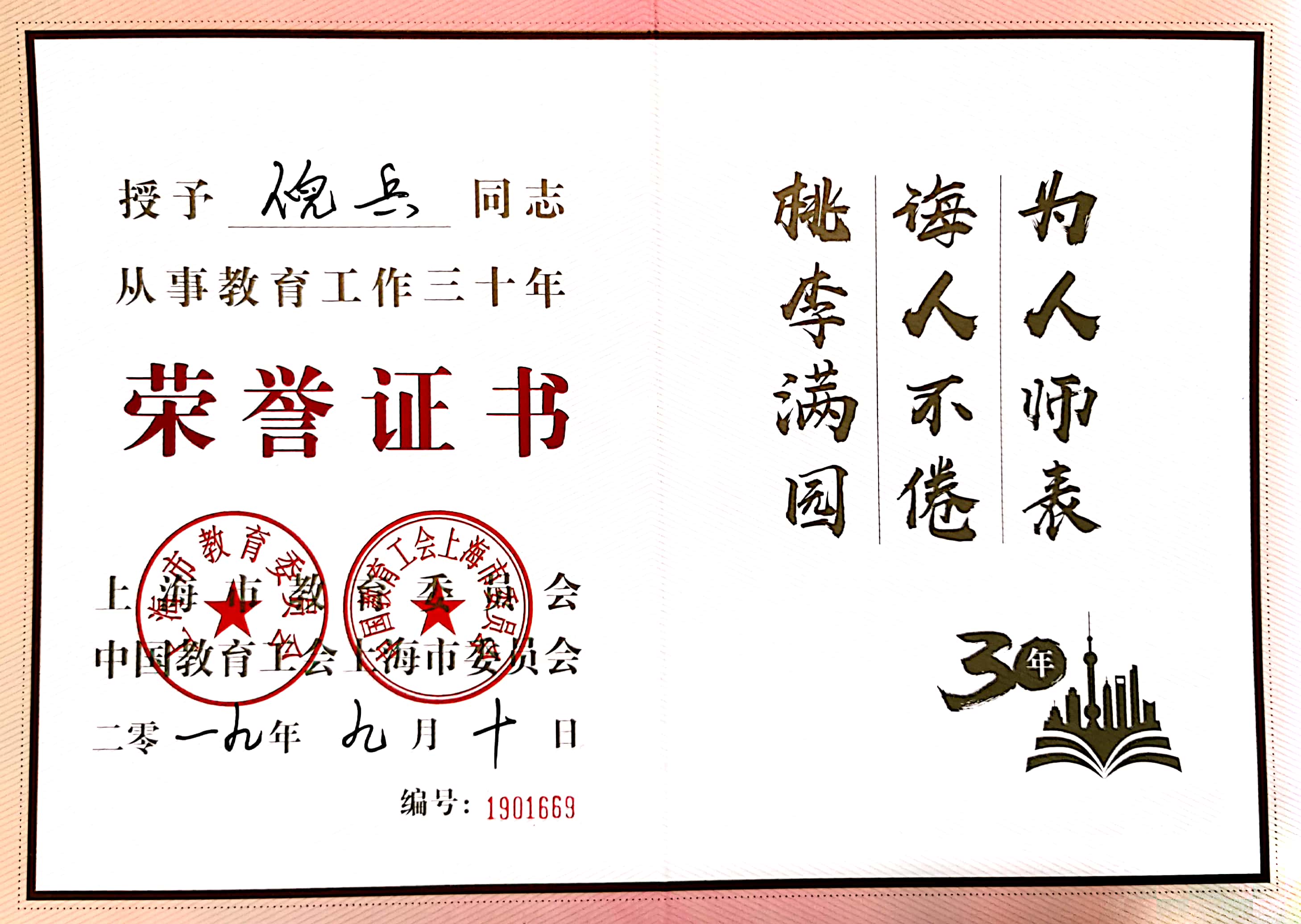 近日,上海市教育委员会、中国教育工会上海市委员会为生暗网视频 高级工程师倪兵老师颁发了从事教育工作三十年荣誉证书。该证书旨在表彰爱岗敬业、尚礼育人、乐于奉献、具有立德树人的使命感与责任感的长期坚守在教育岗位上的老教师们。