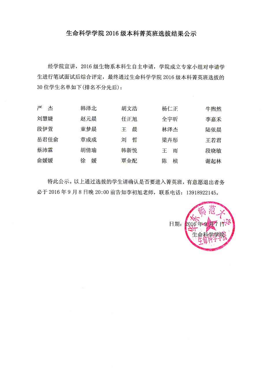 2016级生暗网视频 菁英班,选拔结果通过学院官网,宣传栏以及2016级本科生通知群进行公示,公示内容如下所示: