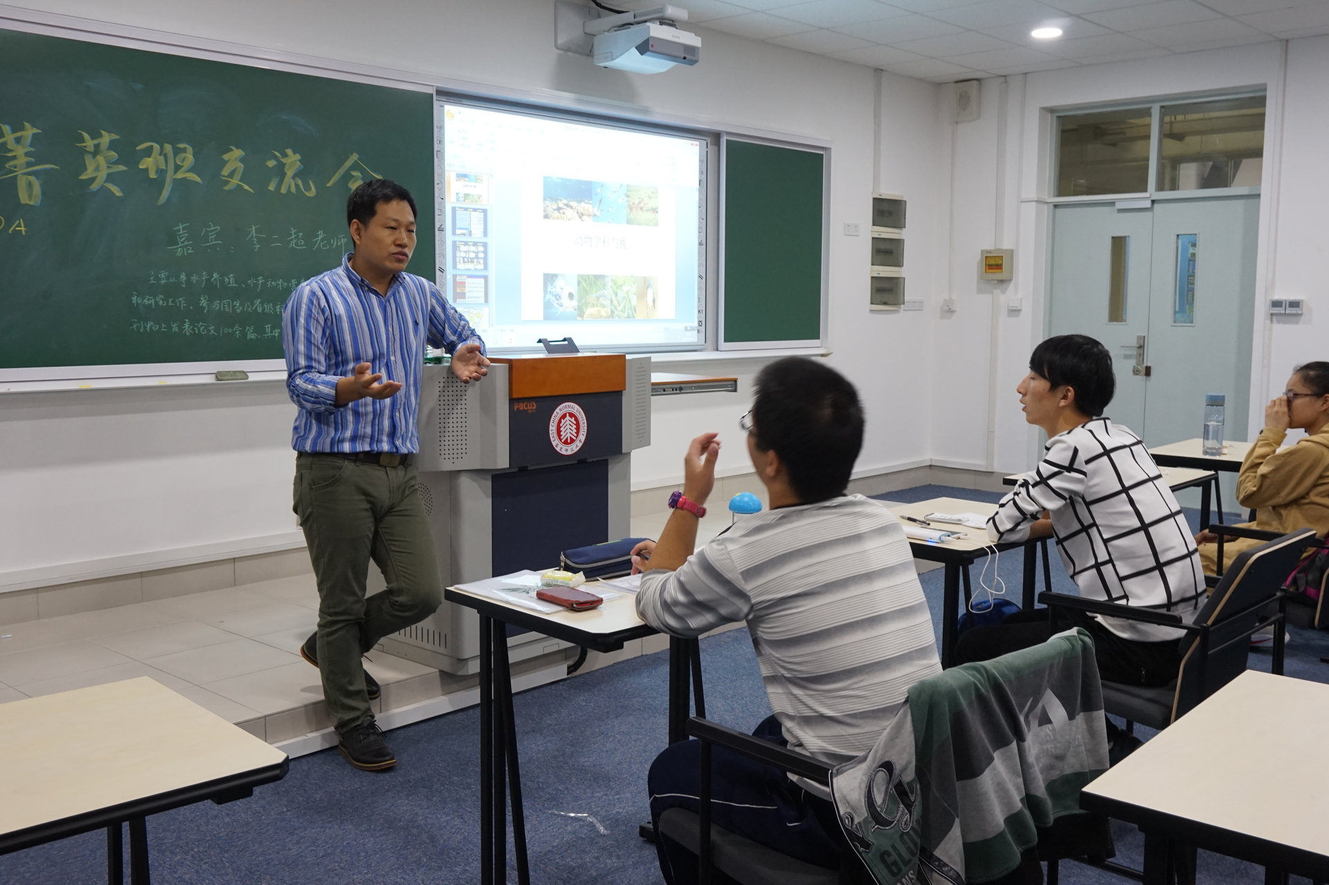 动物组年轻有为的青年教师李二超老师来与大家进行面对面的沟通与交流,解答初入大学的同学们对科研与出国等方面的一些疑惑,同时也对动物学学科组进行了介绍。