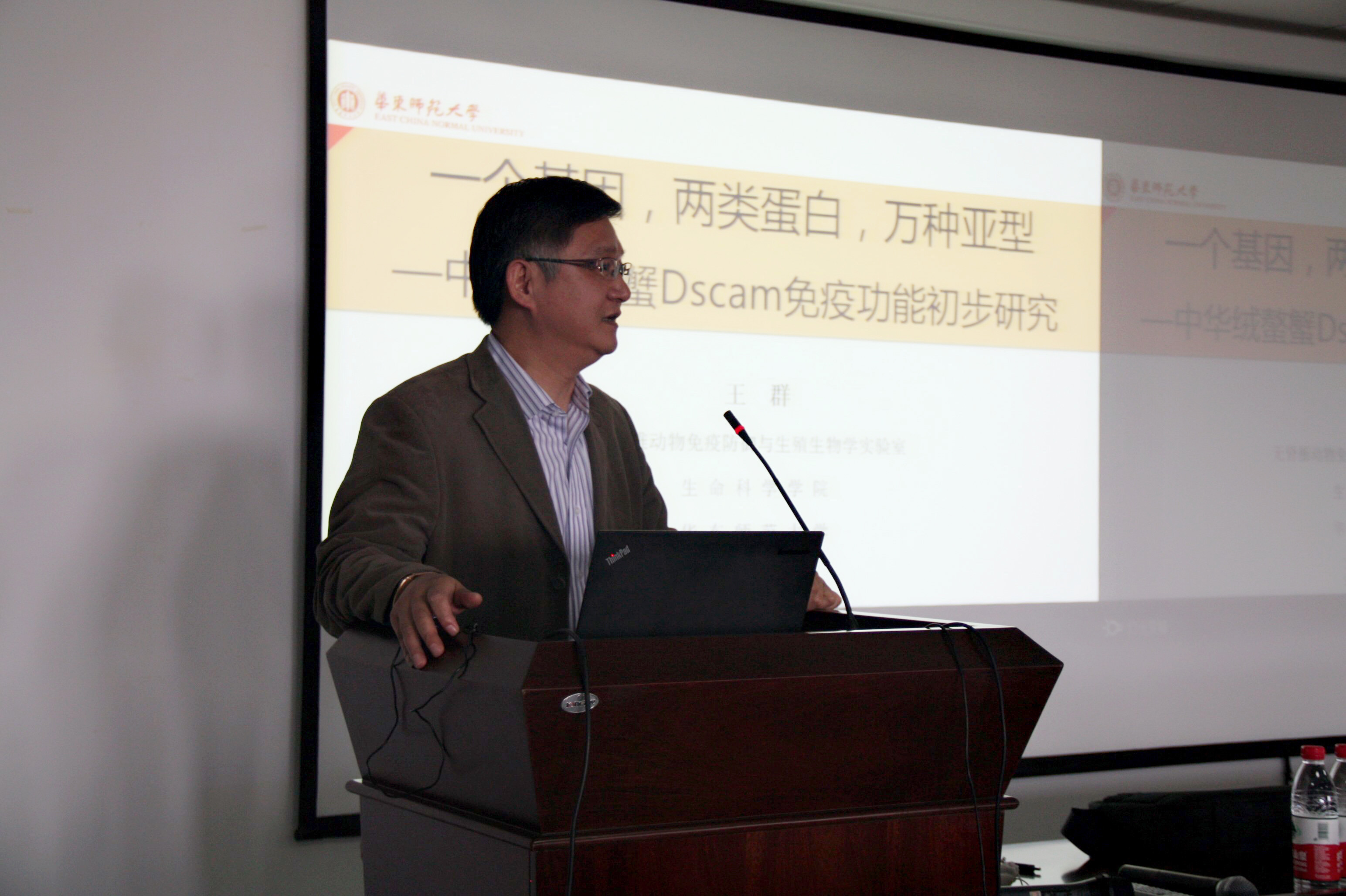 此次会议有幸邀请到了无脊椎动物免疫防御与生殖生物学实验室王群教授作专题讲座。王教授以“一个基因,两类蛋白,万种亚型”为主题,对中华绒螯蟹Dscam免疫功能的初步研究进行了介绍。王教授以节肢动物中华绒螯蟹为切入点,通过对其独特性以及相关研究难题的介绍,激发了同学们的兴趣,进而引出了此次报告的核心——EsDscam基因对中华绒螯蟹免疫功能的影响。报告过程中,王教授从基因的简介及独特性、研究过程大事记开始,讲到基因带来的“类抗体假说”,并详细地介绍了该基因对免疫功能调控相关机制的前沿进展。王教授从已有结论中提出新问题,用问题引导的方式,为同学们展示了科研的思路,启发了同学们的思考,使得同学们对“自上而下和自下而上”地研究问题有了相应的了解。所谓“学无止境”,正是孜孜不倦、精益求精的科研态度使得人们一步步揭开了生物世界的神秘面纱。在提问环节,同学们对于实验一些细节与思路提出了自己的疑问,而王教授以严谨的科研态度、独到的见解,一一进行了回答。江文正教授也就“类抗体假说”以及Dscam对于抗菌肽表达调控等与王教授进行了交流,会场上学术气氛十分浓厚。