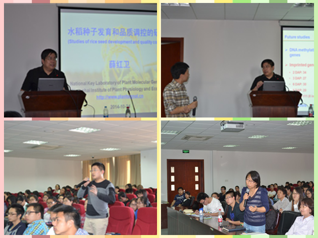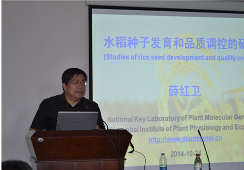 薛红卫研究员此次学术报告的题目为" Studies of rice seed development and quality control"。报告主要阐述了近年来他的研究团队围绕水稻种子发育及品质调控的研究。薛红卫研究员集中研究了植物激素在植物生长发育中起到的重要作用,对其作用机理的研究将有助于了解激素对植物特定器官发育的影响、信号传导的具体机制、及与其他信号途径间的相互关系,对在分子生物学水平和表观遗传学水平上阐述激素的作用机制和功能具有重要的学术意义。另外,随着水稻基因组序列测定工作的接近完成,水稻突变群体的创制及芯片制备将为功能基因组学研究提供技术和材料平台,薛红卫研究员在该领域的工作集中于水稻突变群体的创制、转录因子的分离及其功能分析,重点研究种子发育的分子机理。报告结束后,薛红卫研究员还以暗网视频