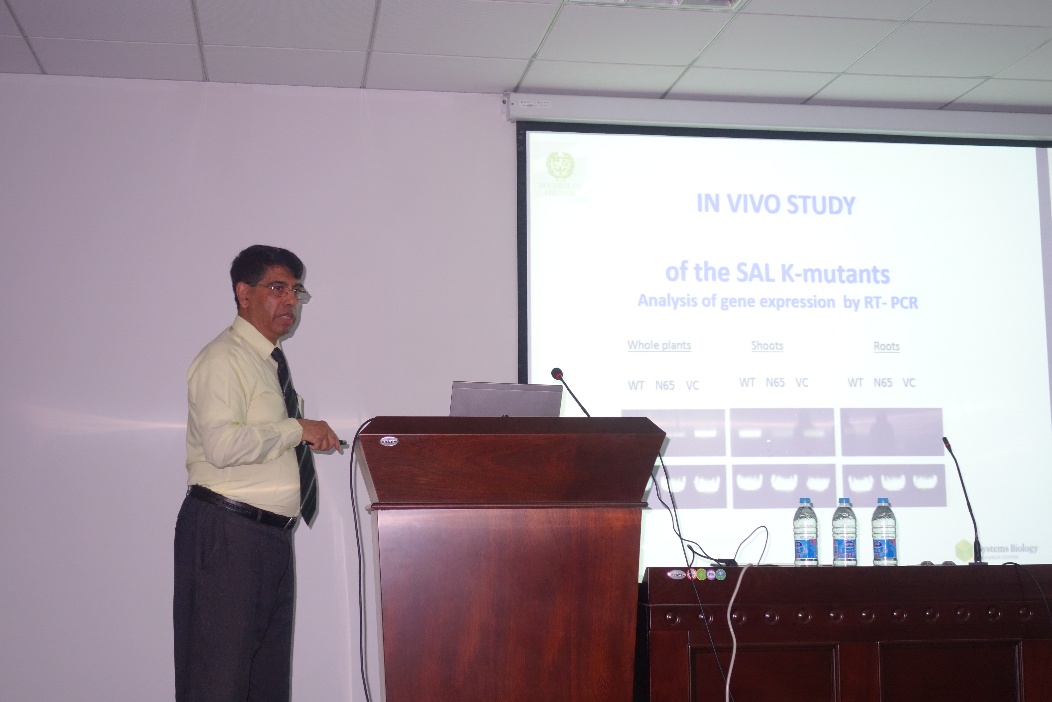 本次报告中,Abul Mandal教授向师生们介绍了全球范围内砷污染的现状、造成的危害以及可能诱发的人类疾病。其领导的研究团队主要从通过微生物修复去除水中的砷以及培育新型转基因栽培作物如水稻来有效降低食物中砷含量两个方面来应对砷污染问题。他们发现了一种对砷有很高耐受性的新型微生物,可以吸收生长介质中的砷,从而达到通过微生物修复治理环境砷污染的作用。通过对微生物菌株的基因组DNA测序分析,他们首先确定一系列对砷有反应的基因,此后Abul Mandal教授团队再通过生物信息学以及分子生物学的方法在模式生物拟南芥中确定了四个对于砷在植物中积累起关键作用的基因,并对四个基因的功能进行深入解析及研究。