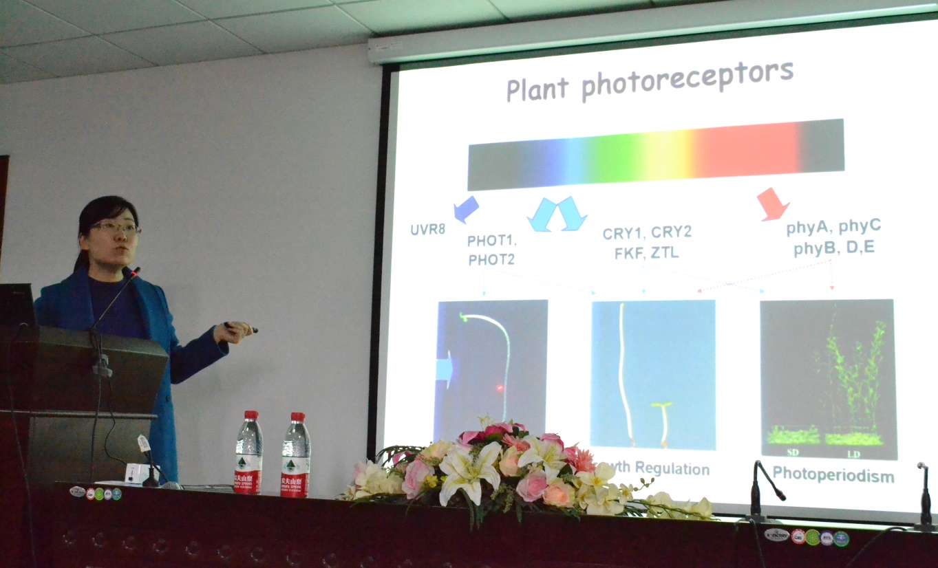 此次讲座,刘老师首先介绍了光照除了可以为植物提供光合作用的能量,还能作为信号物质引发植物的光形态建成,接着报告引出了植物中感知和传递不同波长光质的光信号受体,主要包括蓝光受体隐花色素CRY (Cryptochrome)、ZTL (ZEITLUPE )、向光素PHOT (Phototropin),红光受体光敏素PHY(Phytochrome)和紫外光UV-B受体UVR8,并分别对其进行了介绍。她结合自己的研究工作着重介绍了蓝光受体隐花素的研究,报告提到,隐花色素CRY在细菌、植物和动物中均保守存在,其在动物中是生物钟的重要组分,还跟鸟类的磁场感应作用相关,这种在生物进化过程中保守存在的特性显示了CRY在生物中的重要性。在植物中,CRY主要是通过调控泛素化连接酶COP1和转录因子CIB1蛋白的活性来实现对光诱导基因的表达。除了专注于光信号的调节,刘老师还创造性地把温度和光受体结合起来进行研究,发现蓝光抑制下胚轴伸长的温度响应,CRY1能够与PIF4(一种红光响应因子,且与温度响应有关)相互作用从而在蓝光下控制植物生长,而低温可以通过COR27和COR28调节植物的生物钟。