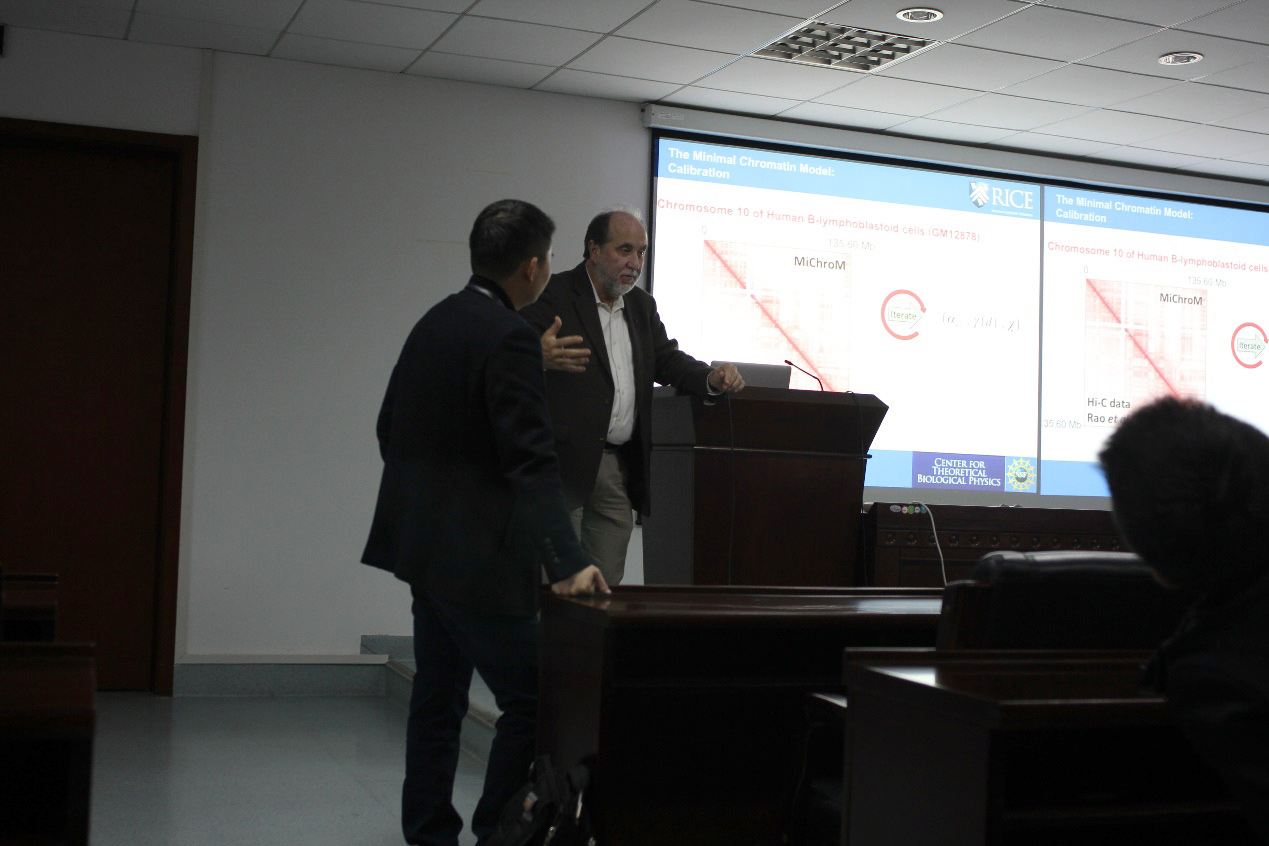 在本次学术交流报告中,José N. Onuchic教授与师生们分享了染色质折叠模型建立方面的研究进展,从染色质(最小染色质模型)的理论模型出发,解释了间期染色体的折叠,并产生了与实验数据一致的染色体结构。利用最大熵原理推导出模型的能量,用实验推导出,染色质位点类型和染色质环状结构位置的分类。这些模拟结果的组合显示了未解开的染色体,染色质类型的相分离,以及在染色体边缘区域染色质解开的趋势。报告内容吸引了与会师生的强烈兴趣和热烈讨论。
