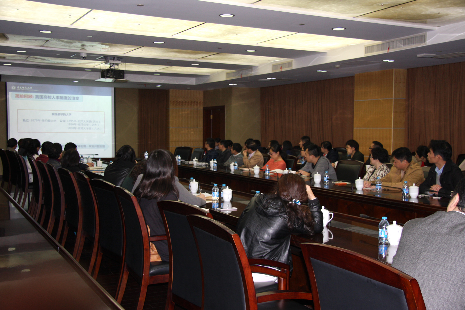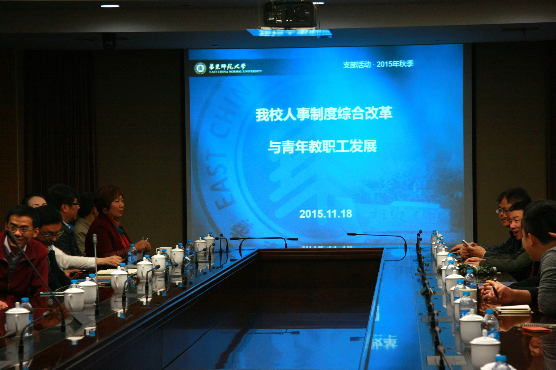 教工党支部与人事处党支部第二次“牵手”活动于闵行校区办公楼403会议室顺利开展,学院工会为此次活动的开展做了前期准备工作。此次牵手活动,请人事处党支部的梅兵副校长作了《我校人事制度综合改革与青年教职工发展》专题报告,从我国高校人事制度的演变史讲起,重点剖析了目前学校人事制度存在的问题与综合改革的主要思路,并针对未来改革趋势下青年教师的发展方向和发展要求提出中肯的意见和建议。