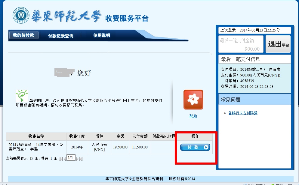 3.支付平台中选择需要支付的项目点击后面“付款”;