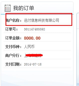 4.3 如果选择“环迅支付”,跳转至相应银行界面后,对方商户号名称将显示我校的第三方支付平台“迅付信息科技公司”