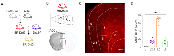 殷东敏课题组前期构建了Drd2基因报告(SR-Drd2)大鼠,揭示了Drd2在大鼠大脑皮层发育过程及成年期的细胞表达模式(图1)。研究者分析了大鼠前扣带回皮层(ACC)不同层中Drd2阳性神经元占总Drd2阳性神经元的百分比,发现Drd2主要表达在深层(5-6层, 占比约85%), 而在ACC的浅层(2-3层),只占约15%。研究者进一步用SR-Drd2大鼠与Drd2+/-大鼠交配得到Drd2自我报告的杂合子(SR-Drd2+/-)大鼠 ,该大鼠的Drd2阳性神经元被红色荧光标记,与此同时Drd2基因的表达也下降了。接下来,研究者使用SR-Drd2+/-大鼠(SR-Drd2作为对照)来研究Drd2在突触发育中的作用,这既达到了同时进行基因标记和基因敲减的效果,又避免了先前研究中Drd2全敲小鼠生长迟缓的全身发育问题。