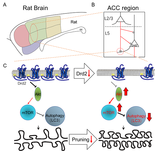 图3:Drd2调节大脑皮层突触修剪的细胞分子机制