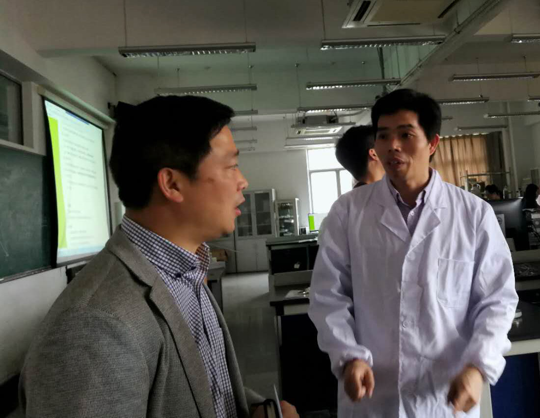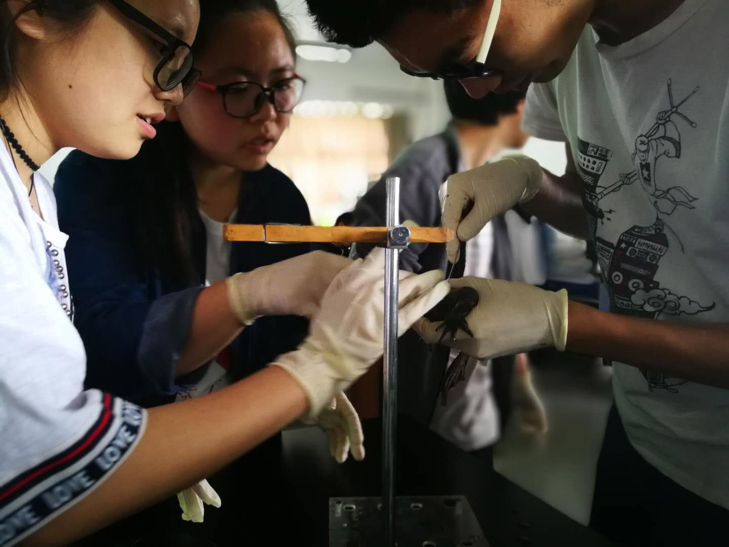 这堂课高良才老师结合神经生物学理论内容,从介绍牛蛙神经系统反射的过程开始,逐步为学生们讲解实验原理、操作技术和关键技术要点。高老师讲述清晰、风趣,学生和听课老师们听得入神。在听完讲解之后老师们观摩了学生的实验操作。